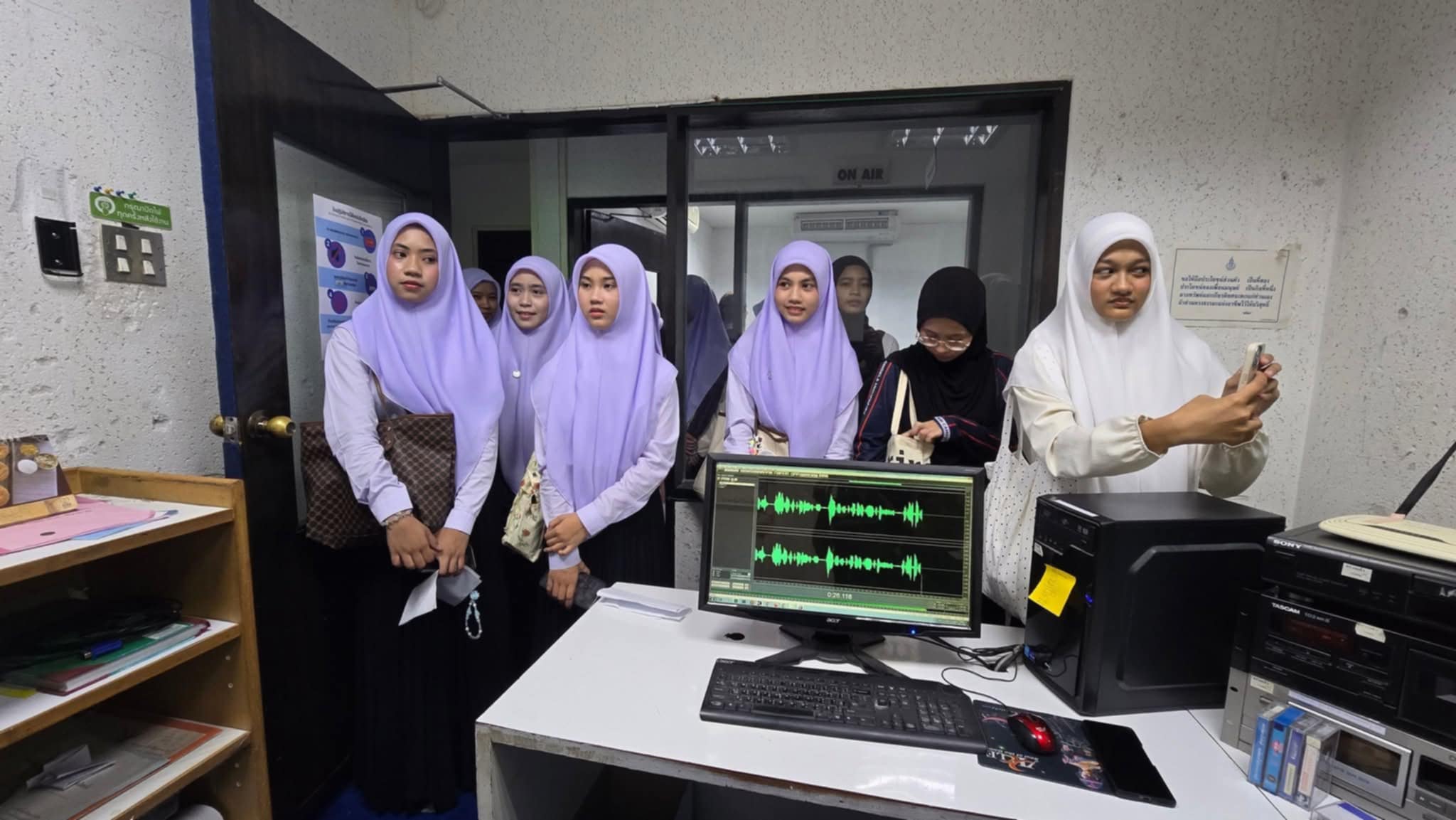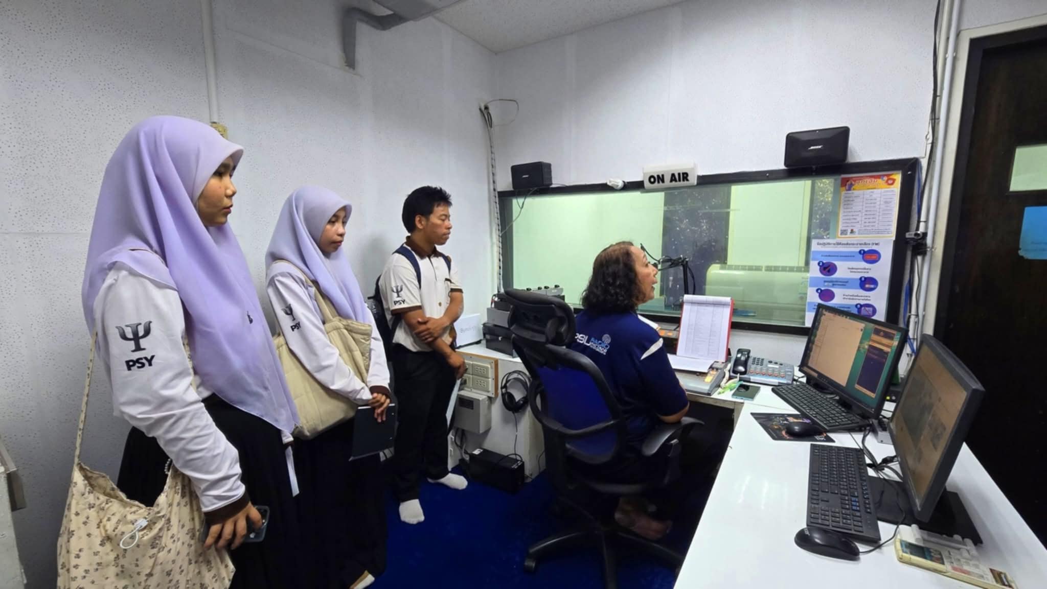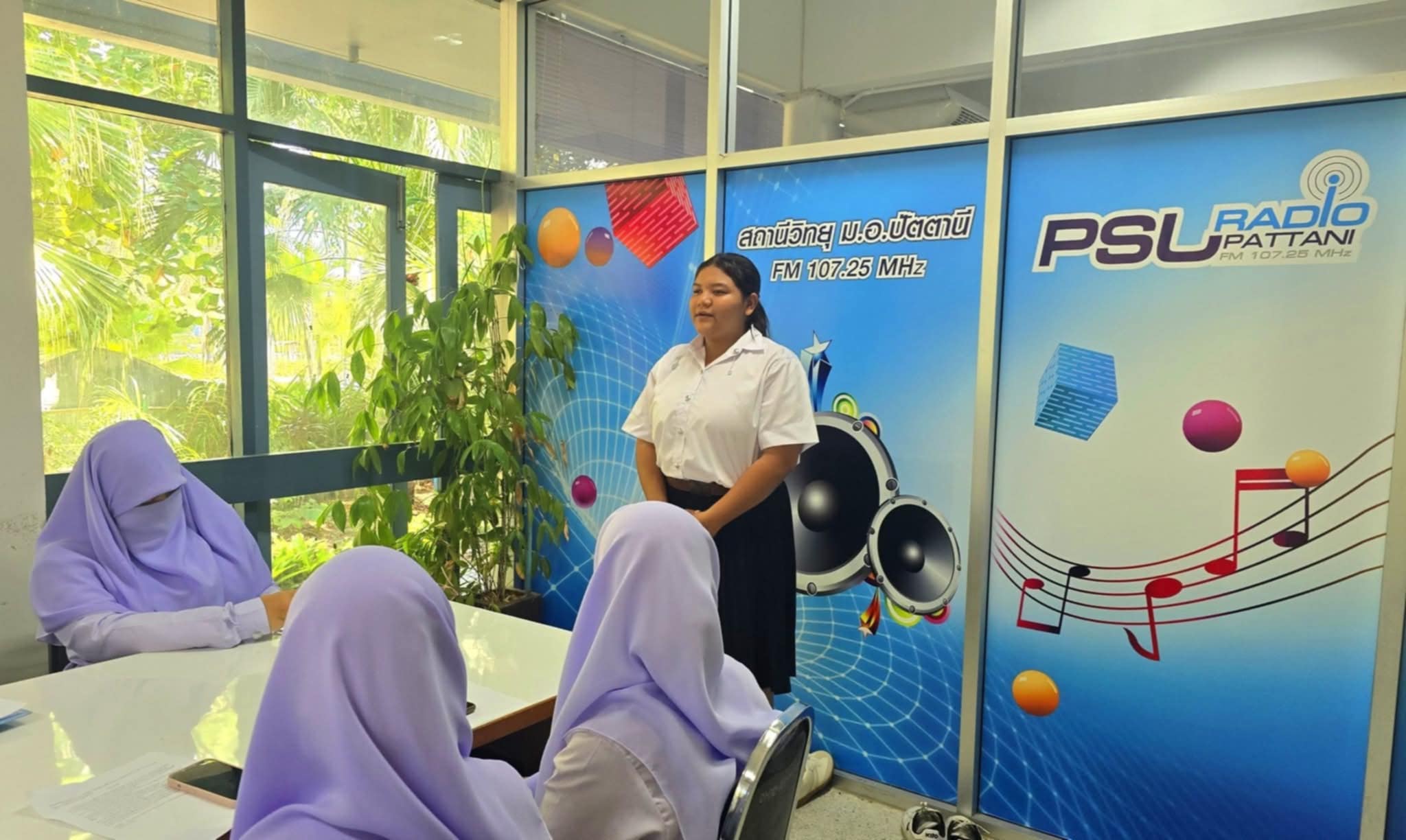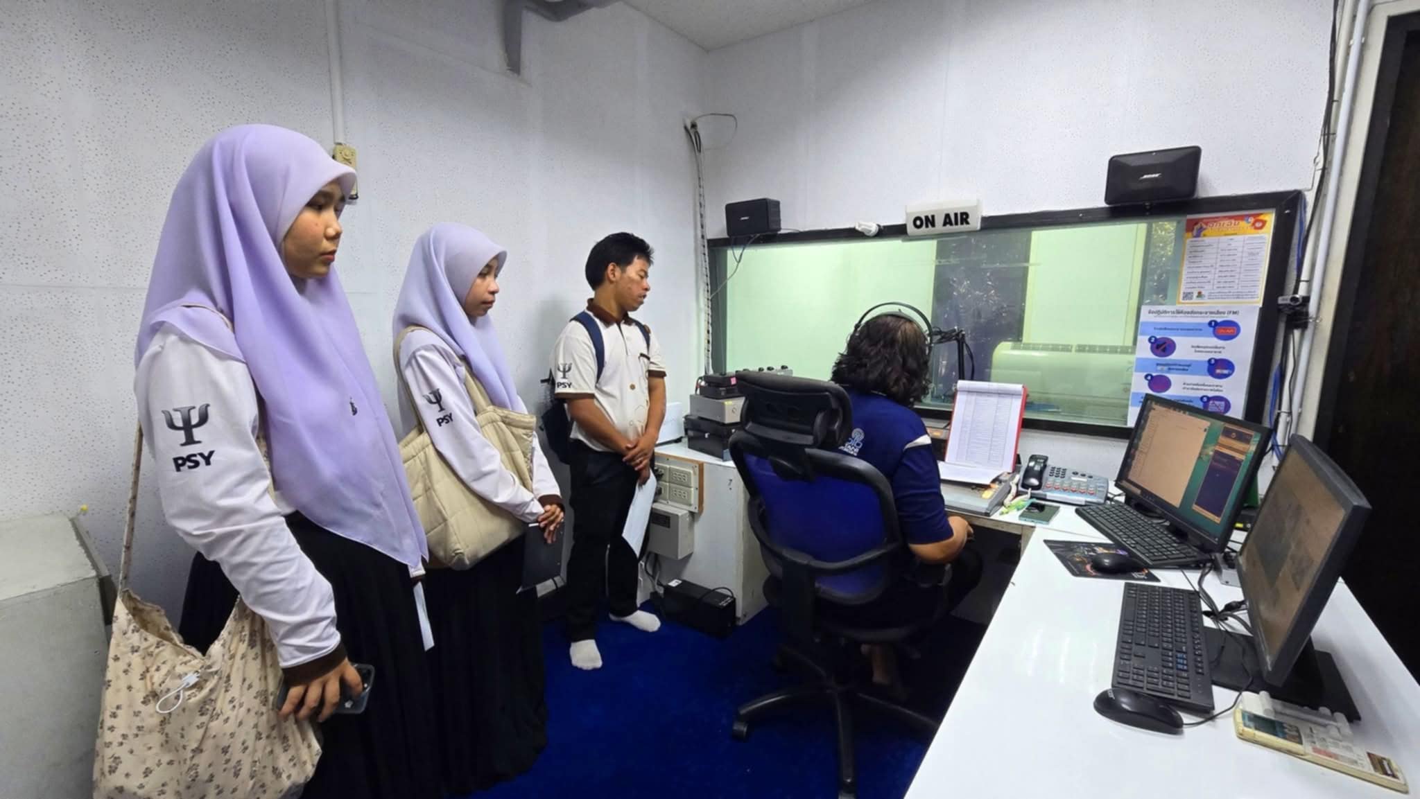 วันที่ 17 กรกฎาคม 2568 ณ สถานีวิทยุ ม.อ.ปัตตานี — นักศึกษาหลักสูตรศิลปศาสตรบัณฑิต สาขาวิชาภาษาและวรรณคดีไทย คณะมนุษยศาสตร์และสังคมศาสตร์ มหาวิทยาลัยสงขลานครินทร์ วิทยาเขตปัตตานี ศึกษาดูงานและฝึกปฏิบัติการออกเสียงภาษาไทย ในรายวิชา “การพัฒนาบุคลิกภาพและการออกเสียงภาษาไทย” (รหัสวิชา 411-111) โดยมี อาจารย์นันทพร แสงมณี เป็นอาจารย์ผู้สอน โดยมีผู้ร่วมกิจกรรม รวม 86 คน