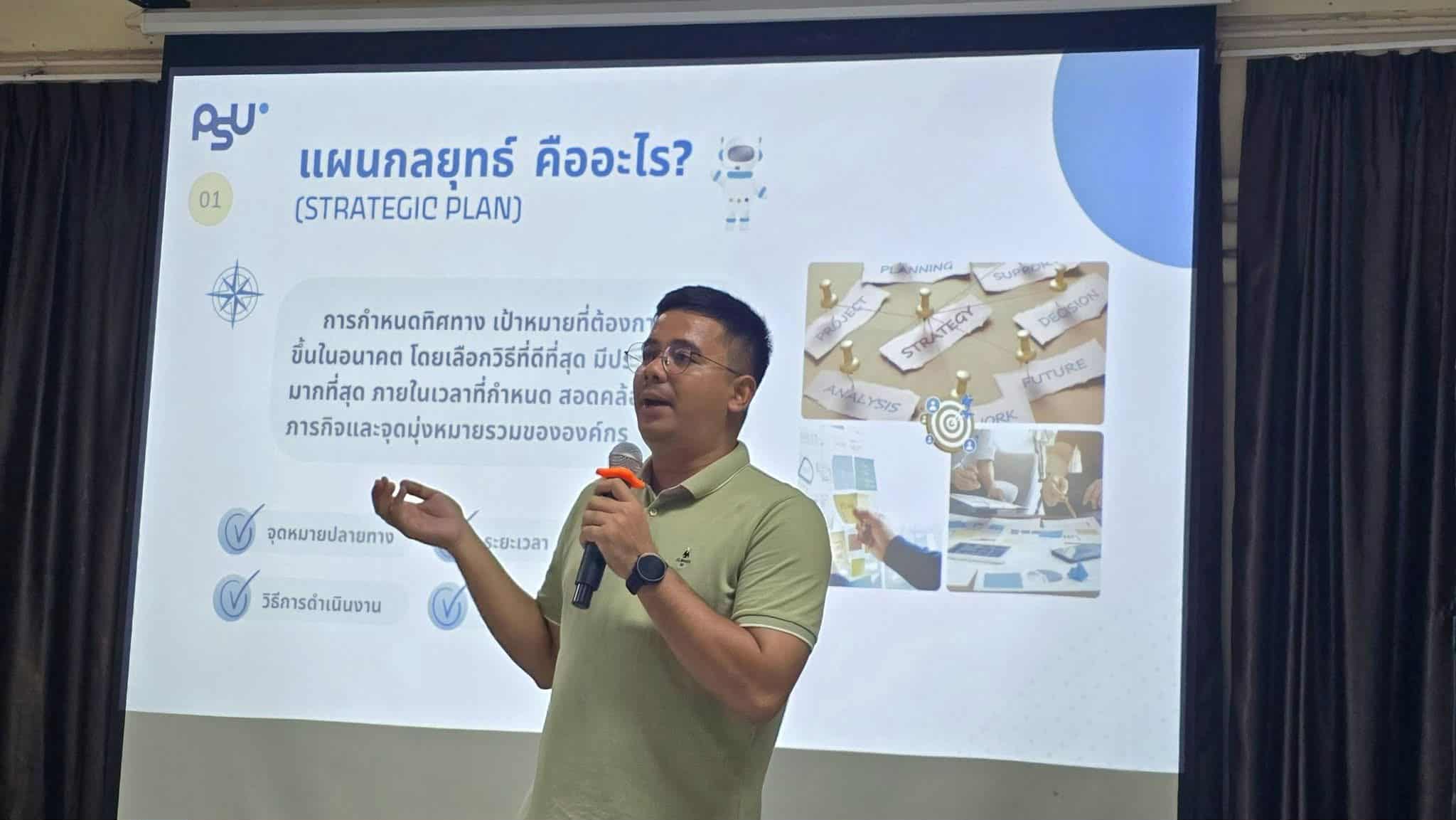 ด้านการสื่อสารองค์กร (พ.ศ.2569–2572) มหาวิทยาลัยสงขลานครินทร์ วิทยาเขตปัตตานี Workshop 1 "ทบทวนกลยุทธ์และเป้าประสงค์ (ร่าง) แผนกลยุทธ์การสื่อสาร วิทยาเขตปัตตานี (พ.ศ.2569-2572) (ร่าง)แผนกลยุทธ์การสื่อสาร วิทยาเขตปัตตานี (พ.ศ.2569-2572) Workshop 2 : การจัดทำร่างแผนปฏิบัติ (Action Plan) จำแนกตามกลุ่มเป้าหมายและเป้าประสงค์ และสะท้อนผลการดำเนินงานของ COPs ด้านการสื่อสาร โดยมีวิทยากร นายศักรินทร์ เสาร์พูน และคณะทำงานจากการกองยุทธศาสตร์และพัฒนา วิทยาเขตปัตตานี นำกระบวนการ โดยมีเครือข่ายสื่อสารองค์กร วิทยาเขตร่วมการอบรม
